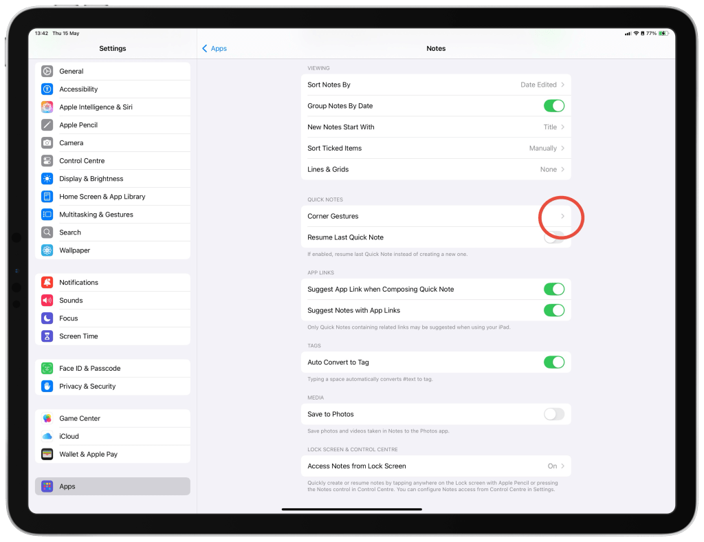 If your quick note is not triggering, you may need to check your “Corner Gestures” setup in “Settings”, “Apps”, “Notes” as below 👇.