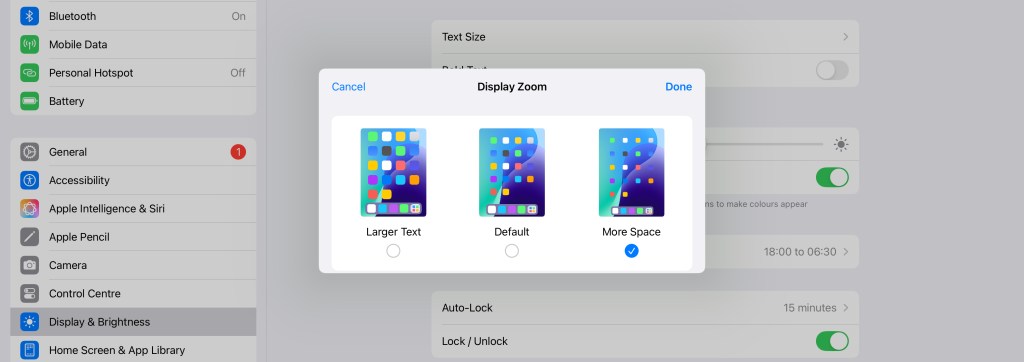 To enable More Space, open the Settings App on your iPad, scroll down and select “Display and Brightness”, tap on “Display Zoom” and select the “More Space” option. Your device may need to restart in order to apply these settings.