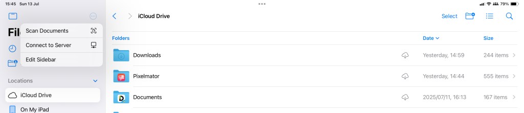 No need for scanning from your printer, your iPad has a great scanner. All you need to do is go to the Files App and select the three dots menu at the top and there you will find “Scan Document” as depicted below. Alternatively you can go to the folder you wish to add your scanned document to and “Long Press” in that space, you will be presented with a menu with “Scan Document”.