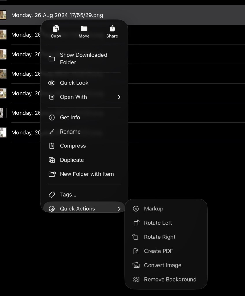 This is a great feature for quickly editing images or PDF’s. For images one can Markup, Rotate Left / Right, Create PDF, Convert Image or Remove the Background. For PDF’s the “Quick Action Tool” provides access to Markup and Optimise File Size.